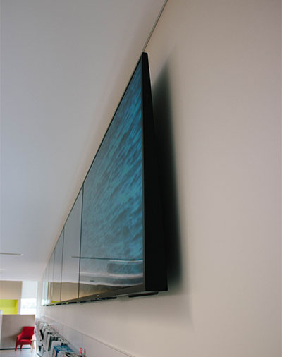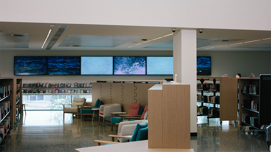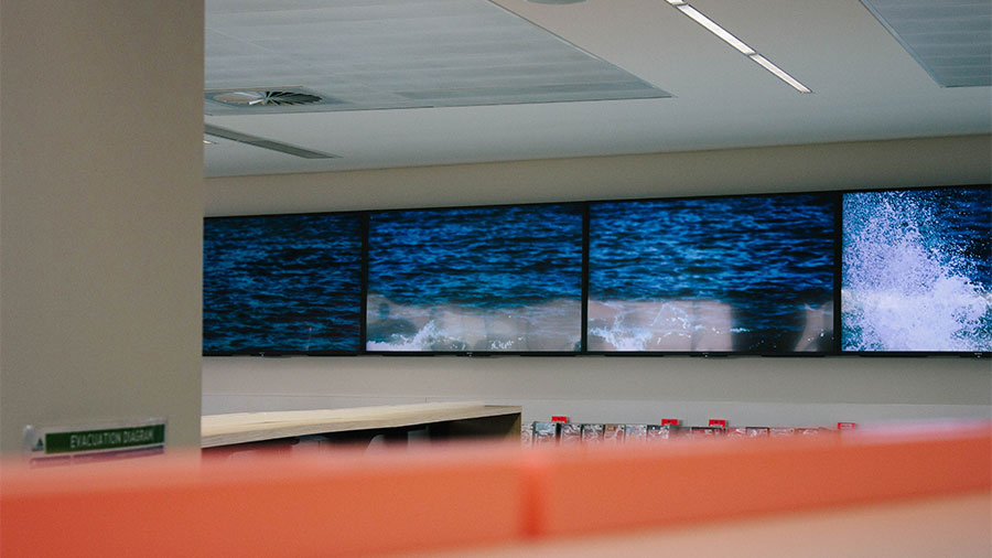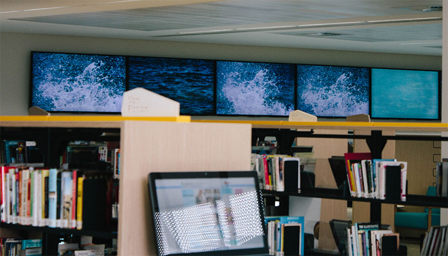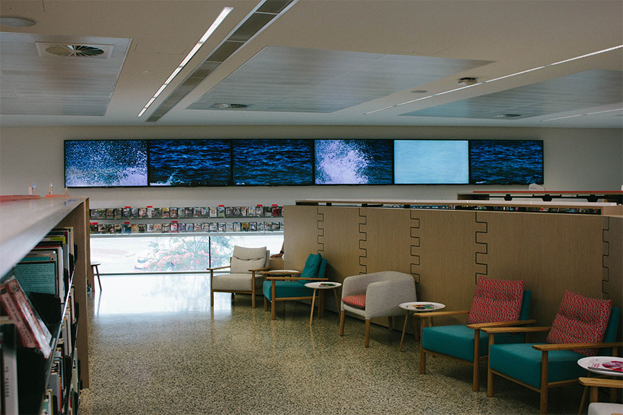 Video images are presented on video screens and as a projection inside the Hallett Cove Civic Centre. The sound component can be heard through speakers in the ceiling when standing in specific locations in the building, and also externally through ‘speaker rocks’.